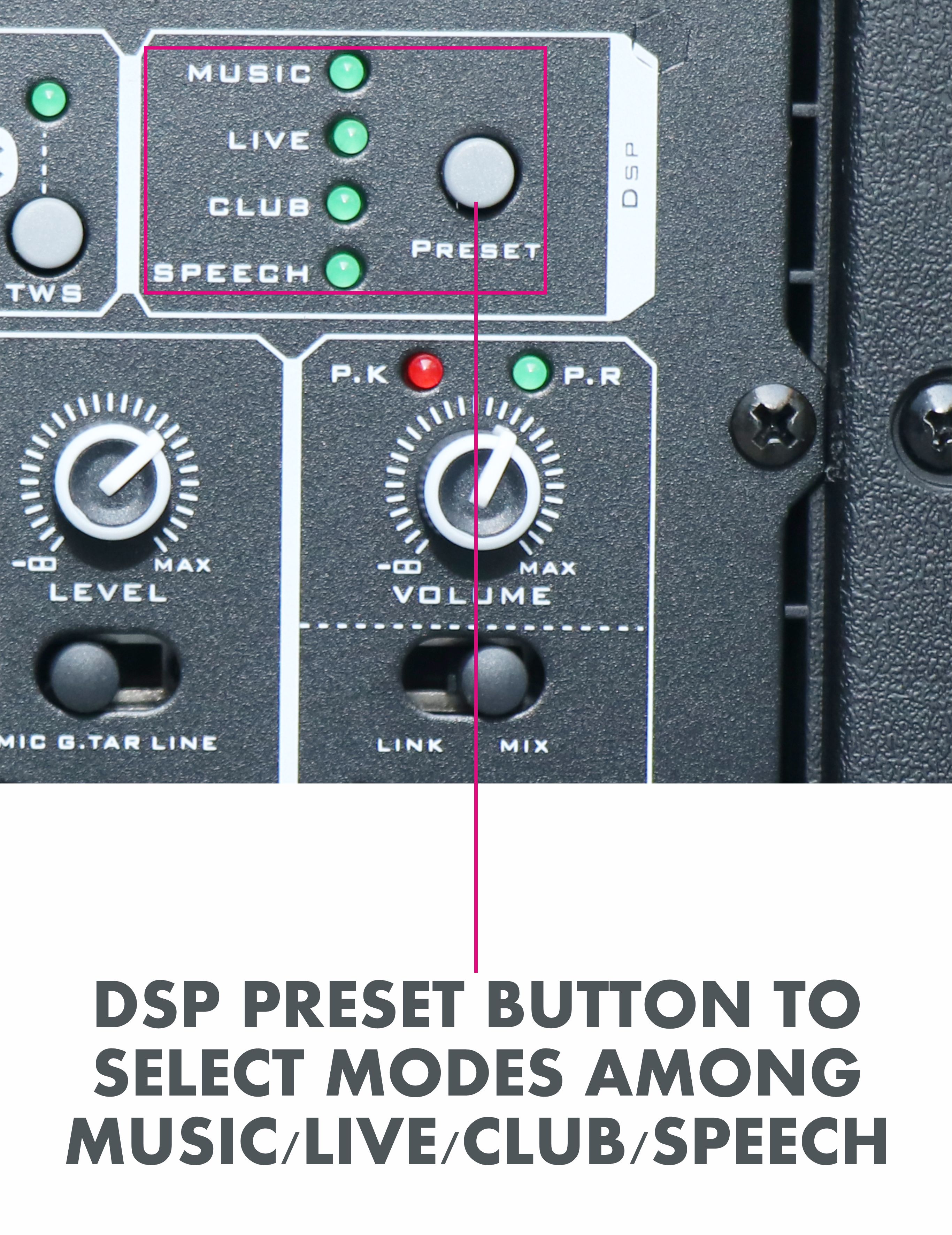 • DSP Preset button to select modes among MUSIC/LIVE/SPEECH/CLUB.